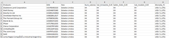 Producto / ISIN / País / Nº de valores / Val_trimestre_EUR/ Saldo_31dic_EUR / Val_modelo_EUR / Moneda_TC.