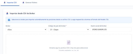 2- IMPORTAR CSV: Seleccionando el Bróker y el país donde se encuentra el centro de operaciones, que nos da servicio como clientes, y soltamos el documento CSV correspondiente.