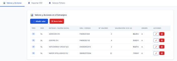 4- Una vez importados los registros en la App, podemos visualizarlos en el apartado, VALORES Y ACTIVOS